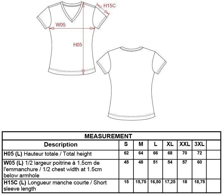 • Vypasovaný střih, úzce lemovaný hluboký výstřih do V, krční lemovka v kontrastní barvě (šedá) u barevných triček a bílá u bílých triček, dvojité švy, pratelné na 40°, lze sušit v sušičce při nízké teplotě, nelze chemicky čistit