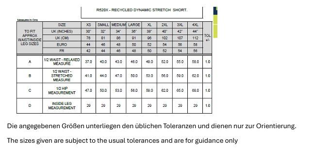 • Größentabelle (Maße können um 5 % abweichen)