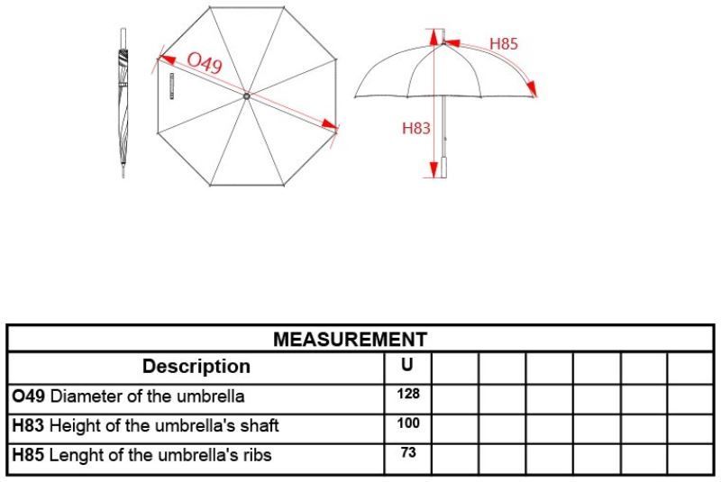 • EVA handle, laminate frame and pole, plastic tips, stormproof, REACH standard, manual opening, diameter: 128cm