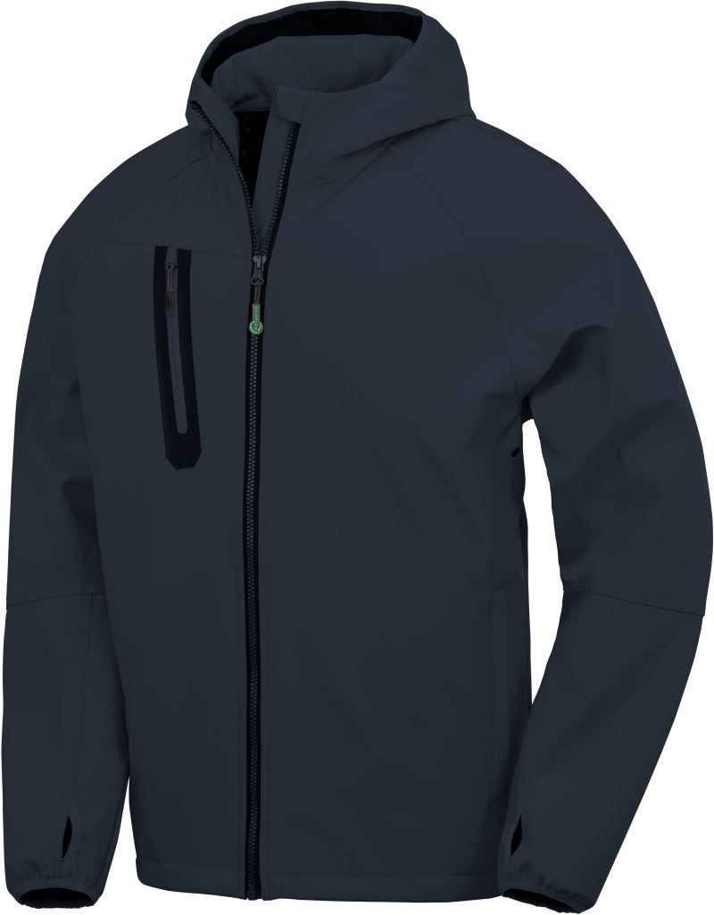 • Odolná proti větru a voděodpudivá (8.000mm vodní sloupec), prodyšná (1.000g/m² za 24h), integrovaná kapuce, elastický okraj rukávů s otvorem na palec, ochranná klopa proti větru, zip s ochranou brady, 2 boční kapsy a 1 náprsní kapsa se zipem, prodloužená záda, poutko, velmi měkký materiál, dobře potisknutelný softshellový materiál, neutrální velikostní štítek, pratelné na 40°, nelze sušit v sušičce